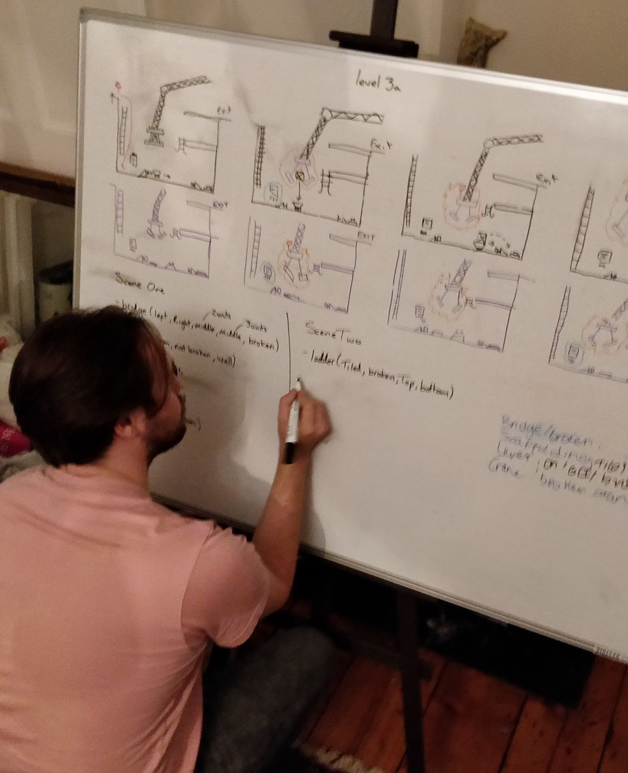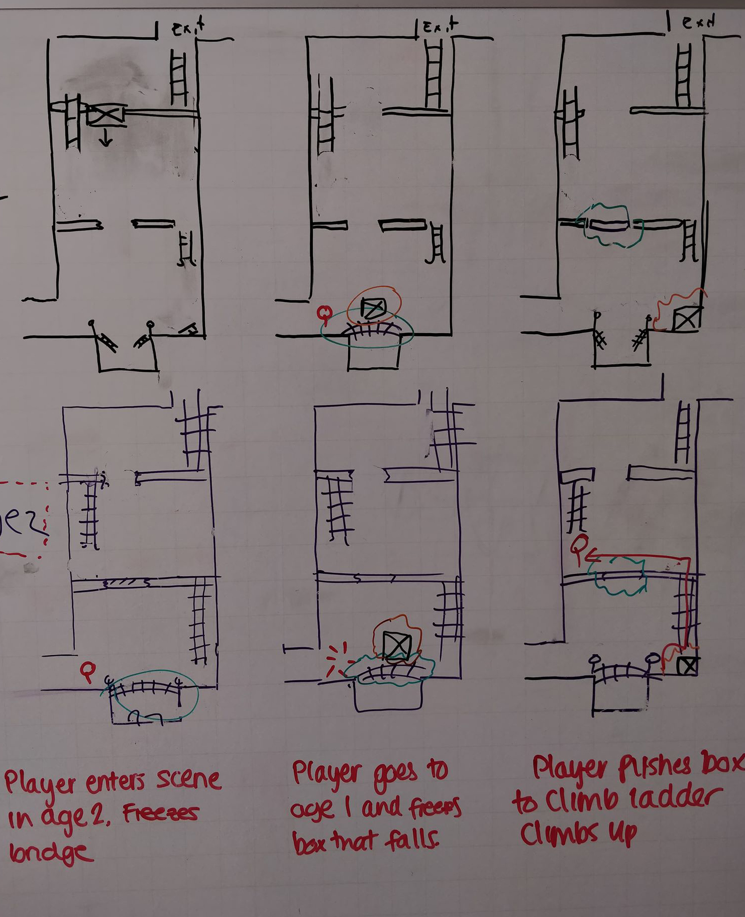 After deciding on the mechanics, it was time to start designing the puzzles in the game. Although the game is obviously digital, it is much quicker to design something with a pen and paper, or in our case a big whiteboard. With multiple colours of pens in our hand, we set an evening aside to design a finite set of puzzles that we could use to represent the extent of the mechanics, whilst also presenting a range of challenges to the player. From this design session we came away with 3 things project name