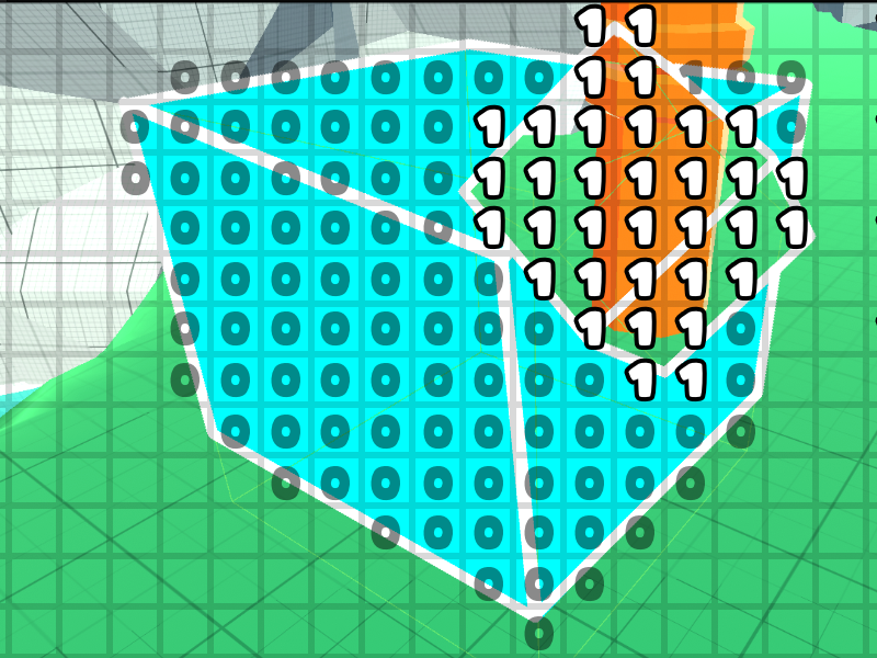 In this example above is an abstraction of how the values would look during the reading process of the stencil buffer, it can be seen that the write objects placed the value 1 in the stencil buffer and where the write objects does not overlap the read object no values have changed and the buffer is 0. with some logic here it is possible to not render anything where the overlap occurs, by rendering all of the pixels in the buffer that are not equal to the value in the buffer.